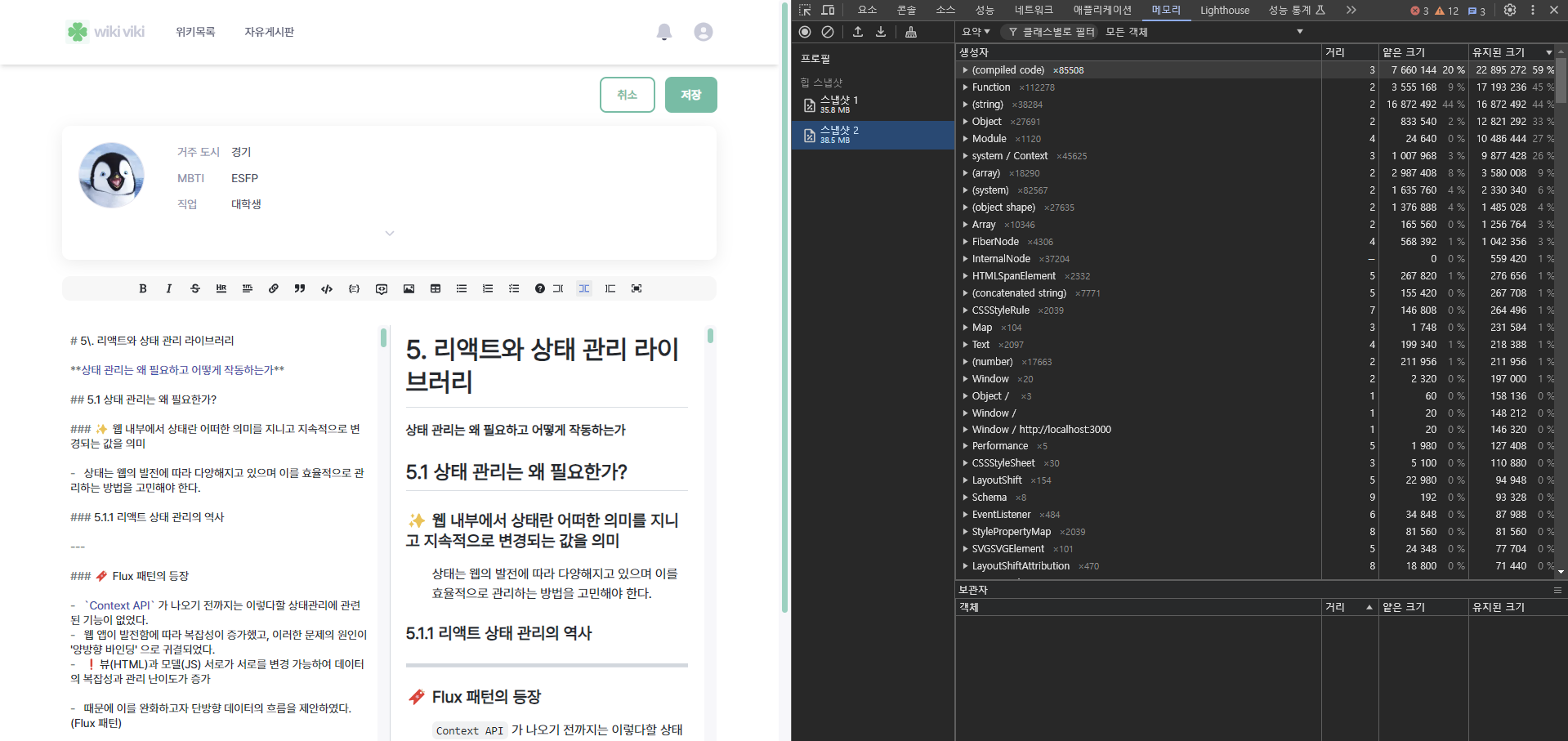 - 첫번째 페이지를 실행하고 스냅샷을 촬영하면 페이지의 다양한 구성요소들이 메모리를 맛있게 먹고 있는 모습을 볼 수 있다.